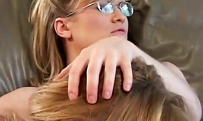 2 nasty nerdy lesbian girls having tons of fun with a string on dildo