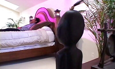 Ebony harlot gets boinked in threesome wearing kinky purple outfit