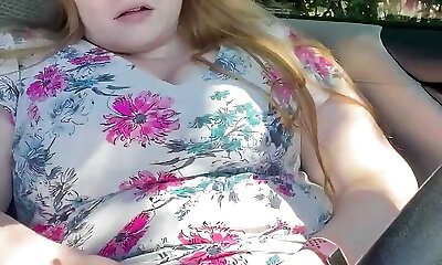 Busty woman plays in car