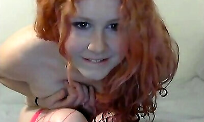 Skinny redhead with tiny bumpers and a wooly pussy dances on w